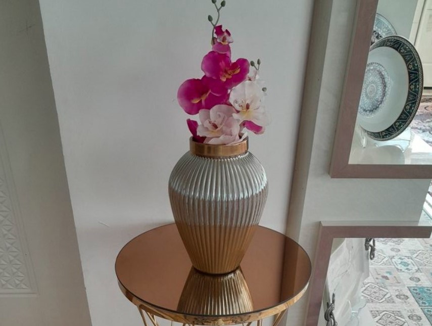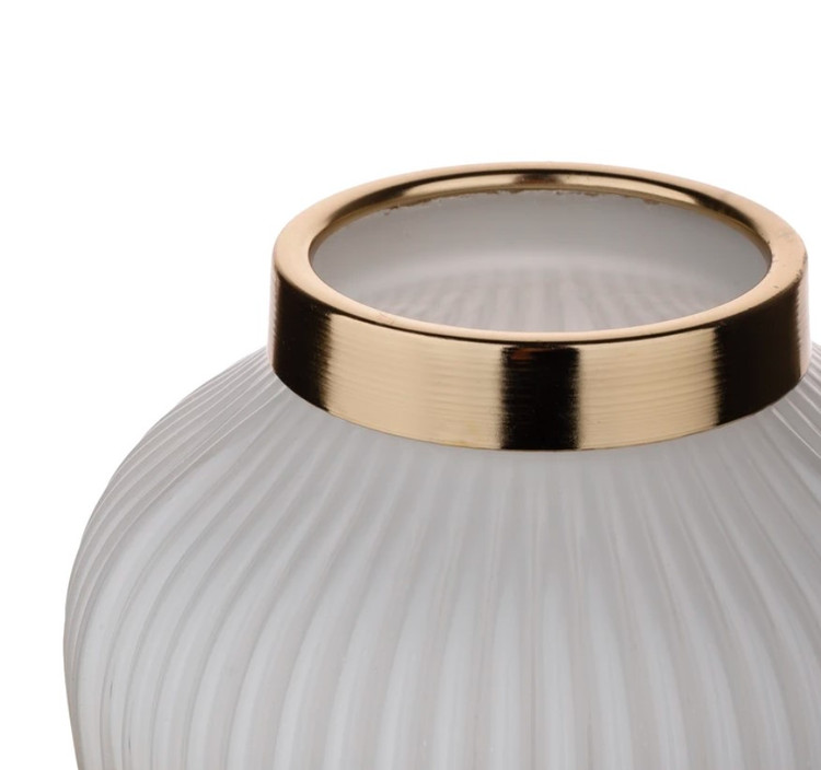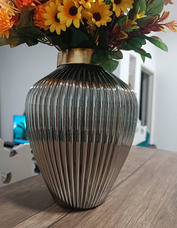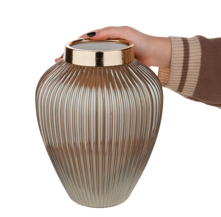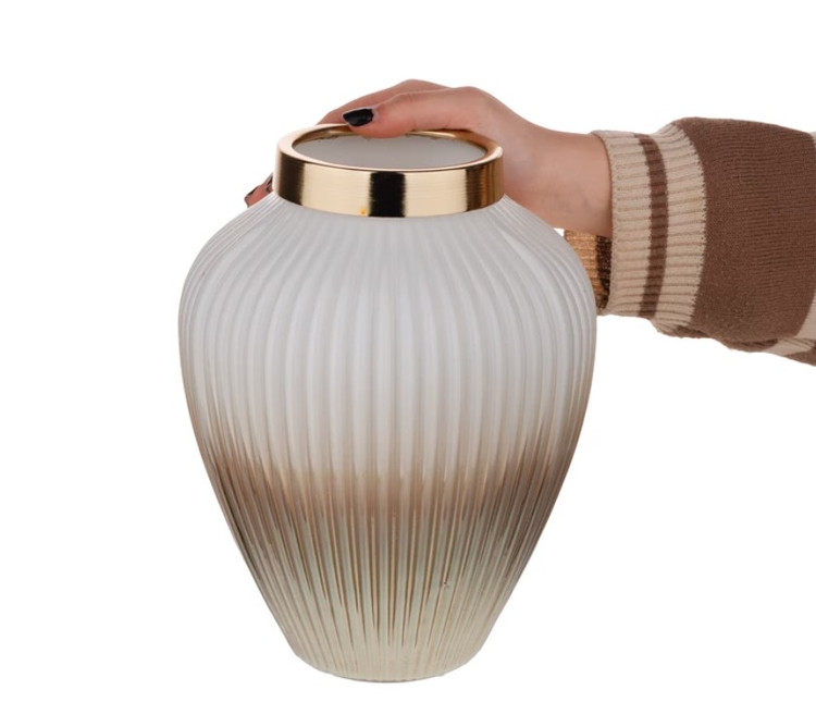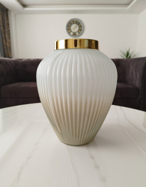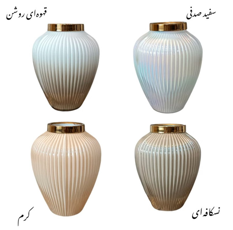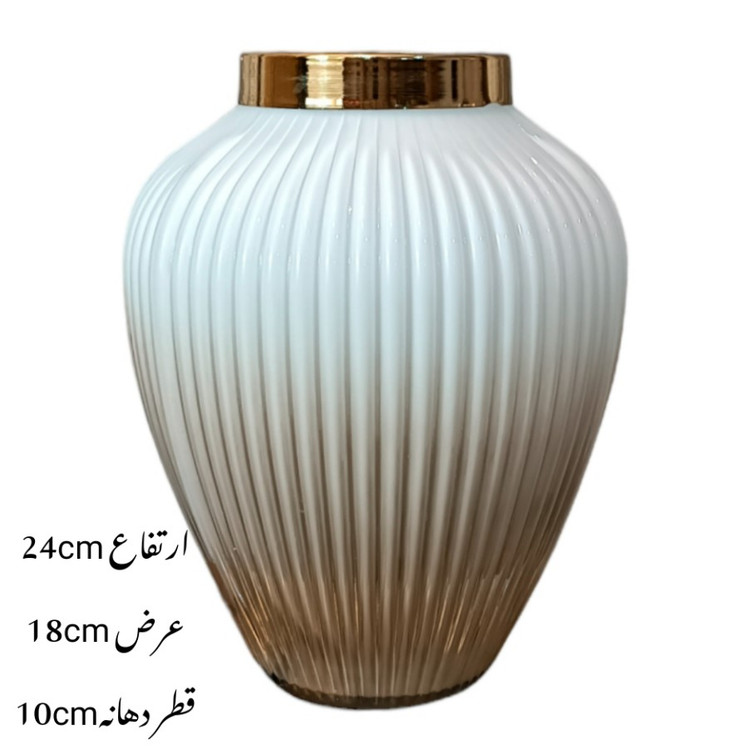 این گلدان دکوری دارای طرح شیاری می باشد. این گلدان ها دارای طوقه طلایی براق و با کیفیت می باشند. برای نگهداری گل طبیعی و مصنوعی و همچنین به عنوان دکوری بسیار مناسب می باشد .